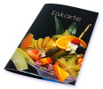 A printed folder in the form of a menu, folded in half.